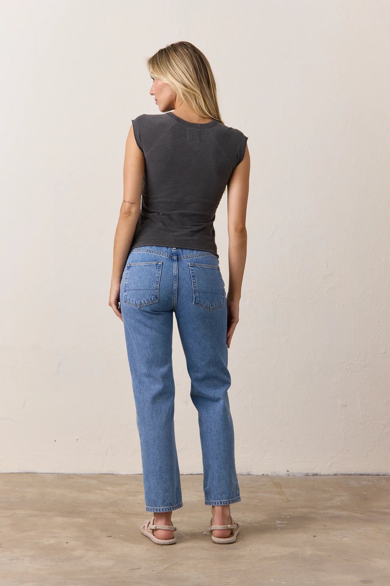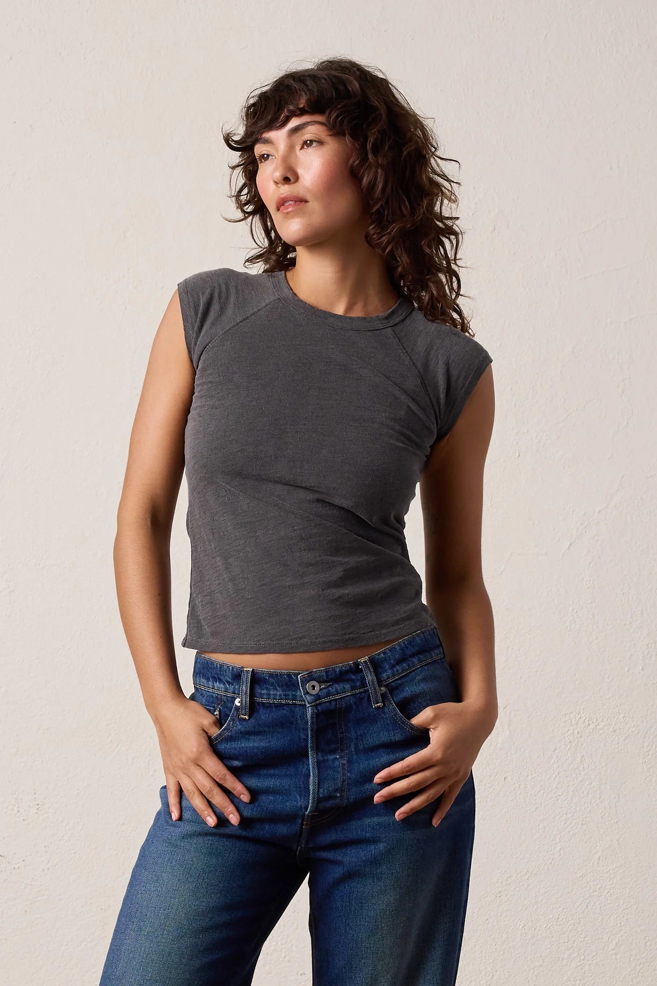 The Chloe T from NSF is a stretchy fitted crew neck tee with high cap sleeves, raw edges and light distressing on the neckline. Vintage slub cotton jersey fabric is textured and lightweight. 100% Cotton Knit. Made in Los Angeles.